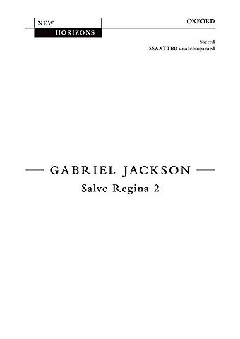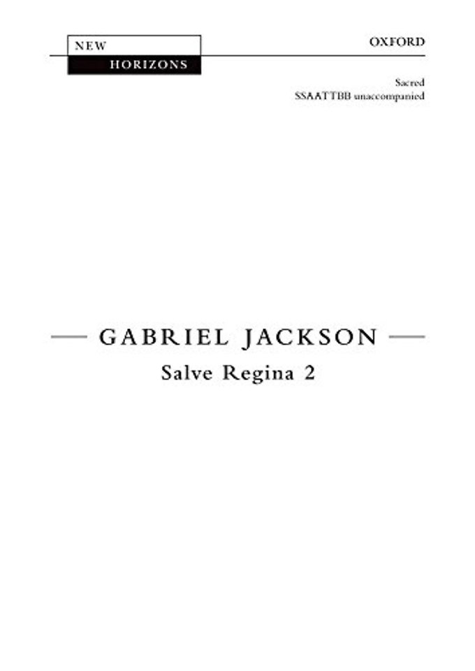 Written in 2004, Jackson harks back to the time of the Eton Choirbook with this expansive polyphonic Salve Regina, with its intricate and delicate interspersions in English decorating the celebrated Latin hymn in praise of Mary. He sets the words thoughtfully with climaxes and resolutions, contemplative passages, and grandiose fanfare-like moments.