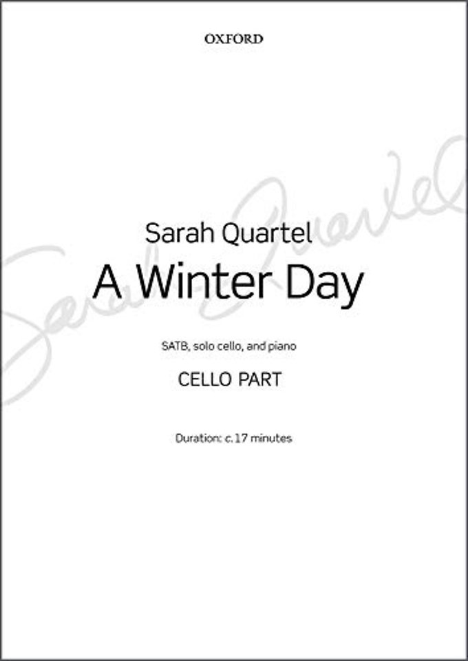 Cello part for Sarah Quartel's five-movement work celebrating the long Canadian winter, setting texts by the composer, Sara Teasdale, Lucy Maud Montgomery (of 'Anne of Green Gables' fame), and Melville Cane. Each movement depicts a different time of day, beginning with the cold darkness before dawn ('Timid Star') and concluding with the evening turning into dusk and then darkness ('Snow Toward Evening'). The music conjures up vivid images of a cold and crisp winter, and of swirling, dancing snowflakes.