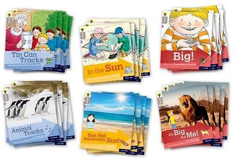 The Level 1 pack contains 36 books, six of each of the following titles: Tin Can Tracks, Animal Tracks, In the Sun, Sun Hat, Sunscreen, Sun!, Big!, As Big As Me!.