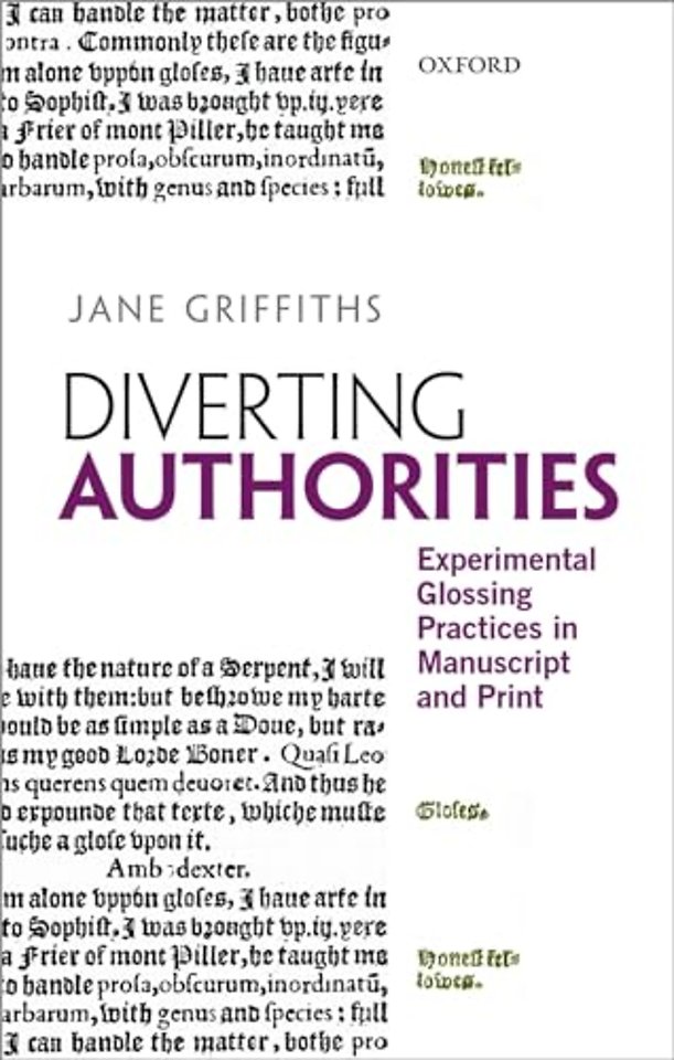 Diverting Authorities examines the glossing of a variety of fifteenth- and sixteenth-century texts by authors including Lydgate, Douglas, Chaloner, Baldwin, Bullein, Harington, and Nashe. It is concerned particularly with the use of glosses as a means for authors to reflect on the process of shaping a text, and with the emergence of the gloss as a self-consciously literary form. One of the main questions it addresses is to what extent the advent of print affects glossing practices. To this end, it traces the transmission of a number of glossed texts in both manuscript and print, but also examines glossing that is integral to texts written with print production in mind. With the latter, it focuses particularly on a little-remarked but surprisingly common category of gloss: glossing that is ostentatiously playful, diverting rather than directing its readers. Setting this in the context of emerging print conventions and concerns about the stability of print, Jane Griffiths argues that---like self-glossing in manuscript---such diverting glosses shape as well as reflect contemporary ideas of authorship and authority, and are thus genuinely experimental. The book reads across medieval-renaissance and manuscript-print boundaries in order to trace the emergence of the gloss as a genre and the way in which theories of authorship are affected by the material processes of writing and transmission.