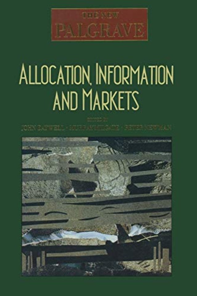 Efficient allocation, S.Reiter; adverse selection, C.Wilson; asymmetric information, A.Postlewaite; auctions, V.L.Smith; bidding, R.Wilson; the coase theorem, R.D.Cooter; decentralization, E.Malivaud; economic organization and transaction costs, S.NM.S.Cheung; exchange, R.Wilson; experimental methods in economics, V.L.Smith; externalities, J.J.Laffont; fraud, E.Karni; hidden actions, moral hazard and contract theory, R.Guesnerie; implicit contracts, C.Azariadis; incentive compatibility, J.O.Ledyard; incentive contracts, E.P.Lazear; incomplete contracts, O.Hart; incomplete markets, C.Wilson; market failure, J.O.Ledyard; mechanism design, R.B.Myerson; moral hazard, Y.Kotowitz; natural selection and evolution, S.G.Winter; organization theory, T.Marschak; perfectly and imperfectly competitive markets, J.Roberts; principal and agent, J.E.Stiglitz; public goods, A.Sandmo; revelation of preferences, J.J.Laffont; search theory, P.Diamond; signalling J.G.Riley; teams, R.Radner.