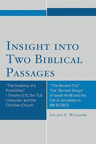The first study uses the TLG computer database for a new interpretation of I Timothy 2.12, exploring the effect of the interpretation on exegesis, gender pronouncements, hermeneutics, tradition, theology, and relevance. The second insight study discusses seeing the 'suffering servant' of Isaiah 40-55 as the city of Jerusalem.
