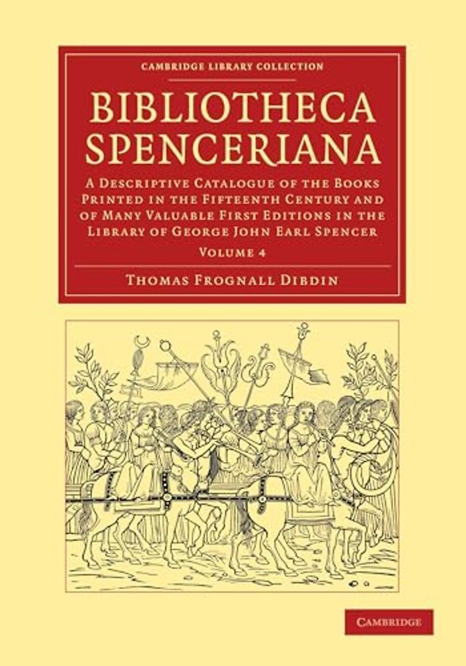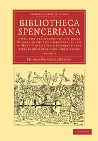 At his death, George Spencer (1758–1834) had created the greatest private library in Europe. At the time, many aristocrats were spending huge sums acquiring rare printed books. With monastic and aristocratic libraries in Europe being dissolved, collectors had access to thousands of examples. The Second Earl Spencer's interests were in English 'black-letter' printing, especially the works of Caxton, and continental incunables, particularly first editions of Greek and Latin classics. Thomas Dibdin (1776–1847) was employed as Spencer's librarian and visited Europe searching for new acquisitions. Published in 1814–15, this catalogue is of the earliest and rarest items in the collection. Each is described in detail, with reproductions of woodcuts and engravings, making this a fascinating record of one man's commitment to collecting the earliest examples of this revolutionary invention. Volume 4 includes many examples of the earliest work of Caxton, alongside first editions of Boccacio and Dante.