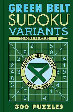 The Martial Arts Puzzle Series is ranked by different color belts. The Green Belt volume contains medium-difficulty puzzles, and features sudoku variations such as overlapping grids, irregular regions, diagonals, and more.
