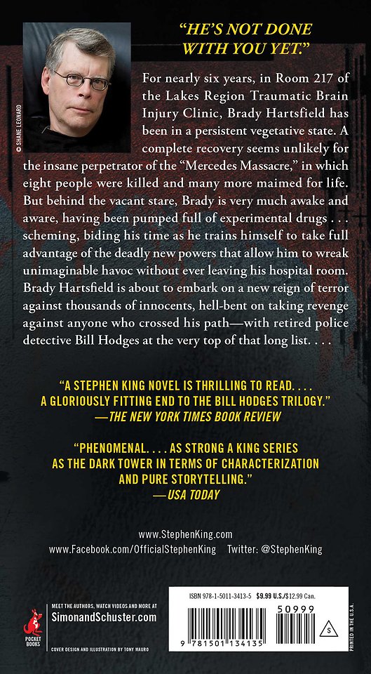 For nearly six years, in Room 217 of the Lakes Region Traumatic Brain Injury Clinic, Brady Hartsfield has been in a persistent vegetative state. A complete recovery seems unlikely for the insane perpetrator of the “Mercedes Massacre,” in which eight people were killed and many more maimed for life. But behind the vacant stare, Brady is very much awake and aware, having been pumped full of experimental drugs...scheming, biding his time as he trains himself to take full advantage of the deadly new powers that allow him to wreak unimaginable havoc without ever leaving his hospital room. Brady Hartsfield is about to embark on a new reign of terror against thousands of innocents, hell-bent on taking revenge against anyone who crossed his path—with retired police detective Bill Hodges at the very top of that long list....