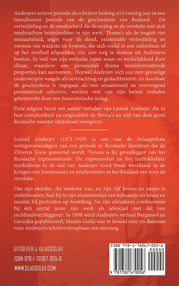 Deze uitgave bevat een aantal verhalen van Leonid Andrejev die in hun compleetheid en originaliteit de thema's en stijl van deze grote Russische meester uitstekend weergeven.