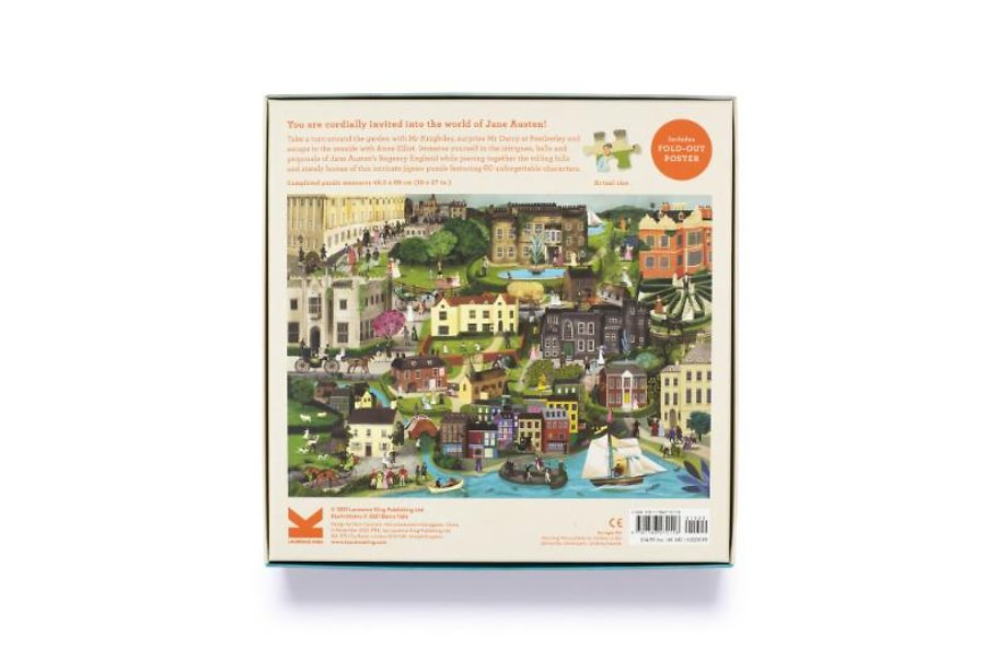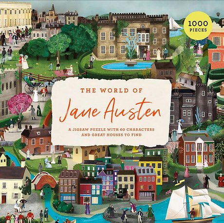 A 1000 piece puzzle, featuring a wide cast of Austen's contemporaries and characters. Hidden among the rolling hills of Derbyshire, Hampshire, Lyme Regis and more, you can see Mr Darcy at home in Pemberley, or find Mr Knightly enjoying a stroll around the garden plus many more familiar characters hidden alongside Austen's peers.