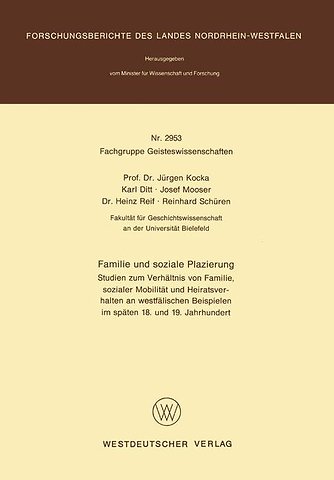 I. Theoretischer Kontext und Ziele, Methoden und Eingrenzung der Untersuchung (Heinz Reif).- 1. Das Ausgangsproblem: Strukturen sozialer Ungleichheit.- 2. Zum Zusammenhang von Familie und sozialer Schichtung.- 3. Die familiale Funktion der Plazierung.- 4. Soziale Mobilität als Ausgangspunkt.- 5. Untersuchungsgegenstand — Quellengrundlage — Methoden und Begriffe.- 6. Arbeitsschritte.- 7. Methodische Probleme und Grenzen der Untersuchung.- II. Adelsfamilie und soziale Plazierung im Münsterland 1770–1914 (Heinz Reif).- 1. Wirtschaftliche und soziale Lage des münsterländischen Adels 1770–1914.- 2. Soziale Mobilität und Heiratsverhalten.- 3. Familiale Dimensionen des Plazierungsprozesses.- 4. Zusammenfassung: Familiale Plazierung, innerfamiliales Konfliktpotential und regionales Schichtungssystem.- III. Familie und soziale Plazierung in der ländlichen Gesellschaft am Beispiel des Kirchspiels Quernheim im 19. Jahrhundert (Josef Mooser).- 1. Wirtschafts- und sozialgeschichtlicher Umriß des Kirchspiels Quernheim.- 2. Soziale Mobilität und Heiratsverhalten.- 3. Mechanismen familialer Plazierungspraxis.- 4. Zusammenfassung.- IV. Familie und soziale Plazierung in einer durch Landwirtschaft, Heimgewerbe und Industrialisierung geprägten Gemeinde am Beispiel des Kirchspiels Borghorst im 19. Jahrhundert (Reinhard Schüren).- 1. Wirtschafts- und sozialgeschichtlicher Umriß von Borghorst.- 2. Soziale Mobilität und Heiratsverhalten.- 3. Die Rolle einiger zusätzlicher Faktoren im familialen Plazierungsprozeß.- 4. Zusammenfassung.- V. Familie und soziale Plazierung in den Bielefelder Unterschichten im 19. Jahrhundert (Karl Ditt).- 1. Wirtschafts- und sozialgeschichtlicher Umriß Bielefelds im 19. Jahrhundert.- 2. Soziale Mobilität und Heiratsverhalten.- 3. FamilialeFaktoren und ihre Rolle im Plazierungsprozeß.- 4. Zusammenfassung.- VI. Einige Ergebnisse (Jürgen Kocka).- 1. Vorbemerkungen.- 2. Intergenerationelle berufliche Mobilität und Persistenz.- 3. Heiratsverhalten, konnubiale Mobilität und Endogamie.- 4. Herausbildung klassengesellschaftlicher Strukturen.- 5. Zur Rolle der Familie.- VII. Tabellenanhang.- VIII. Anmerkungen.- IX. Literaturverzeichnis.- X. Abkürzungsverze ichnis.