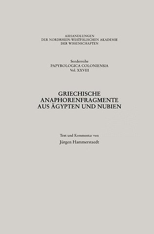 Die Schöpfung schriftlicher Anaphorenformulare am Ausgang der Antike.- Zum Inhalt des Corpus fragmentarisch erhaltener spätantiker und frühbyzantinischer griechischer Anaphoren.- Spätantike und frühbyzantinische Liturgieformulare in Ägypten und Nubien.- Die vermutliche Bestimmung der erhaltenen Anaphorentexte.- Zu Edition und Kommentar.- Weitere Abkürzungen.- Edition und Kommentar.- PStraßb. gr. inv. 254 (van Haelst, Catalogue nr. 998): Gratiarum actio und Interzessionen der Markosanaphora.- PLitLond. 232 (van Haelst, Catalogue nr. 934): a) Gratiarum actio und Interzessionen der Markos/Kyrillosanaphora b) Dankgebet nach Kommunion.- PVindob. G 16545+17047/38329/38379: Interzessionsgebete, Einsetzungsbericht und Anamnese der Markosanaphora.- PRyl. gr. 465 (van Haelst, Catalogue nr. 976f): a) Post-Sanctus, Einsetzungsbericht, Anamnese, Zweite Epiklese und Schlußdoxologie der Markos/Kyrillosanaphora; b) Fürbitte für die Verstorbenen.- PVindob. G 26134 (van Haelst, Catalogue nr. 1024): Epiklese und Schlußdoxologie der Markos/Kyrillosanaphora.- Qa?r Ibrim fr. III a/c (vgl. van Haelst, Catalogue nr. 766): Voranaphorische Gebete; Beginn der Markos/Kyrillosanaphora mit Gratiarum actio und Interzessionen.- Qa?r Ibrim fr. III d (vgl. van Haelst, Catalogue nr. 766): Aus den Interzessionen der Markos/Kyrillosanaphora.- Qa?r Ibrim 1964, 4/12 (vgl. van Haelst nr. 766): Interzessionen der Markos/Kyrillosanaphora.- «Athanasiosanaphora» aus Qa?r Ibrim (vgl. van Haelst nr. 766): Bitte um Frieden und für die Kirche.- PVindob. G 19337 (van Haelst, Catalogue nr. 637): Exzerpt des Anaphorenbeginns in den Constitutiones apostolicae (8, 12, 6–7).- PWürzb. 3 (van Haelst, Catalogue nr. 1036): Zwei Fürbittgebete.- PBerol. 17032 (van Haelst, Catalogue nr. 889): Sanctusund Einsetzungsbericht einer unbekannten Liturgie.- PVindob. G 41043 verso: Post-Sanctus, Darbringung, Bitte um Herabsendung des Heiligen Geistes auf die Gaben.- PCair. 10395 A: Gebet um Begnadung und für die Ruhe der Verstorbenen.- PVindob. G 41044: a) Bitte um Herabsendung des Heiligen Geistes; b) Inklinationsgebet.- PDêr-Balizeh (Oxford, Bodleian Library: MS. Gr. liturg. c. 3) fol. II (van Haelst, Catalogue nr. 737): Interzessionen, Ante-Sanctus, Sanctus, Herabsendungs- und Wandlungsbitte, Einsetzungsbericht und Anamnesis.- Kairo, Koptisches Museum, inv. 753 (Lefebvre nr. 69): Zitat von Ante-Sanctus, Sanctus und Post-Sanctus auf einer Stifterinschrift aus der Marienkirche in Alt-Kairo.- Ostrakon Hall 5880 (van Haelst, Catalogue nr. 819): Ante-Sanctus und Sanctus.- Sunnartifragmente (van Haelst, Catalogue nr. 1062): Gratiarum actio, Ante-Sanctus, Post-Sanctus, Akklamationen, Herabsendungs- und Wandlungsbitte, Einsetzungsbericht.