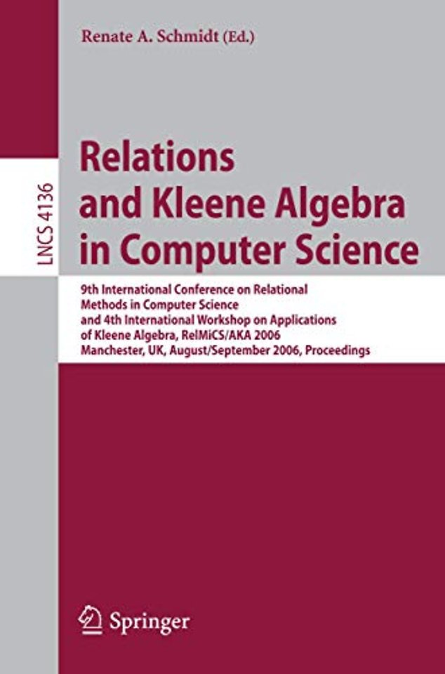 Weak Kleene Algebra and Computation Trees.- Finite Symmetric Integral Relation Algebras with No 3-Cycles.- Computations and Relational Bundles.- An Axiomatization of Arrays for Kleene Algebra with Tests.- Local Variable Scoping and Kleene Algebra with Tests.- Computing and Visualizing Lattices of Subgroups Using Relation Algebra and RelView.- On the Complexity of the Equational Theory of Relational Action Algebras.- Demonic Algebra with Domain.- Topological Representation of Contact Lattices.- Betweenness and Comparability Obtained from Binary Relations.- Relational Representation Theorems for General Lattices with Negations.- Monotonicity Analysis Can Speed Up Verification.- Max-Plus Convex Geometry.- Lazy Semiring Neighbours and Some Applications.- Omega Algebra, Demonic Refinement Algebra and Commands.- Semigroupoid Interfaces for Relation-Algebraic Programming in Haskell.- On the Cardinality of Relations.- Evaluating Sets of Search Points Using Relational Algebra.- Algebraization of Hybrid Logic with Binders.- Using Probabilistic Kleene Algebra for Protocol Verification.- Monotone Predicate Transformers as Up-Closed Multirelations.- Homomorphism and Isomorphism Theorems Generalized from a Relational Perspective.- Relational Measures and Integration.- A Relational View of Recurrence and Attractors in State Transition Dynamics.- On Two Dually Nondeterministic Refinement Algebras.- On the Fixpoint Theory of Equality and Its Applications.- Monodic Tree Kleene Algebra.- Weak Relational Products.