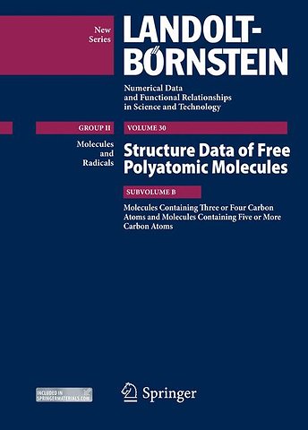 The Landolt-Börnstein volume II/30 contains data on the geometric parameters (internuclear distances, bond angles, dihedral angles of internal rotation, etc.) of free polyatomic molecules including free radicals and molecular ions. This volume is made of two subvolumes, each containing the geometric parameters determined in the gas phase either by an analysis of the rotational constants (and sometimes the vibrational constants) obtained from microwave, infrared, Raman, electronic, and photoelectron spectroscopy or by an analysis of electron diffraction intensities. All data obtained by these methods have been critically evaluated and compiled. The data are presented separately for each molecule, together with original references and computer-drawn figure(s). In this second subvolume, II/30B, the structures of molecules with three or more than three carbon atoms are listed. Subvolume II/30A covers inorganic molecules and molecules containing one or two carbon atoms.