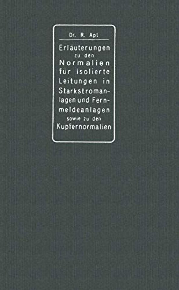 I. Kupfernormalien.- A. Einleitung.- B. Wortlaut der Kupfernormalien.- C. Erläuterungen.- 1. Normaltemperatur.- 2. Spezifischer Widerstand.- 3. Temperatur-Korrektion.- 4. Leitungskupfer.- 5. Drall.- 6. Kontrolle des Grenzwertes.- 7. Querschnittsermittelung.- 8. Internationale Kupfernormalien.- 9. Erläuterung der internationalen Kupfernormalien L.- II. Normalien für isolierte Leitungen in Starkstromanlagen.- A. Einleitung.- B. Wortlaut der Normalien.- C. Erläuterungen.- 1. Einteilung der Normalien.- 2. Leitermetall.- 3. Verzinnung.- 4. Gummihülle.- 5. Kennfaden.- 6. Verwendungsbereich.- 7. Gummiaderleitungen.- 8. Besondere Bauart der G.-A.-Leitungen.- 9. Spannungsprüfung der G.-A.-Leitungen.- 10. Spezialgummiaderleitungen.- 11. Rohrdrähte.- 12. Panzeradern.- 13. Fassungsadern.- 14. Pendelschnüre.- 15. Allgemeines über bewegliche Leitungen.- 16. Zimmerschnüre.- 17. Traglitzen, Erdungsleiter und Metallbewehrung bei Zimmerschnüren.- 18. Werkstattschnüre.- 19. Erdungsleiter bei Werkstattschnüren.- 20. Spezialschnüre.- 21. Hochspannungsschnüre.- 22. Leitungstrossen.- 23. Besondere Bauart der Leitungstrossen.- 24. Gummibleikabel.- 25. Einleiter-Gleichstrom-Bleikabel.- 26. Konstruktionstabelle für Einleiterkabel.- 27. Prüfung der Einleiterkabel.- 28. Aluminiumkabel.- 29. Mehrleiter-Bleikabel.- 30. Konzentrische Bleikabel.- 31. Prüfung der Mehrleiterkabel.- 32. Konstruktionstabellen für Mehrleiterkabel.- 33. Belastungstabelle für gummiisolierte Leitungen.- 34. Belastungstabelle für Bleikabel.- 35. Belastungstabelle für Aluminiumkabel.- III. Normalien für isolierte Leitungen in Fernmeldeanlagen. (Schwachstromleitungen).- A. Einleitung.- B. Wortlaut der Normalien.- C. Erläuterungen.- 1. Allgemeines.- 2. Asphaltdraht.- 3. Draht mit Papierisolation.- 4. Draht mit Lack- und Faserstoffisolation.- 5. Gummiaderdraht.- 6. Kabel ohne Bleimantel.- 7. Kabel mit Bleimantel.- 8. Schnüre.
