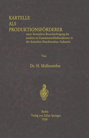 I. Produktionsförderung im Rahmen horizontaler und vertikaler Konzentrationsbewegung.- 1. Begriffe und äußere Erscheinungsformen.- 2. Kritische Gegenüberstellung der produktionsfördernden Wirkungen horizontaler und vertikaler Konzentrationsbewegung.- 3. Von der Kartell- zur Trust- (Konzern-) Wirtschaft?.- II. Begriff der Produktionsförderung im Rahmen der Kartellpolitik.- 1. Mittelbare Produktionsförderung.- 2. Unmittelbare Produktionsförderung.- a) Kartelimaßnahmen und -Einrichtungen.- aa) Systematische Uebersicht.- bb) Die Spezialisation (Begriff, Wesen, Wirkung).- cc) Die Lizenz- und Versuchsgemeinschaft.- dd) Das Exportsundikat.- b) Die Bedeutung der Kartellorganisation für die Durchführung der unmittelbaren Produktionsförderung.- III. Kartelle als unmittelbare Produktionsförderer in der deutschen Maschinenbau-Industrie.- 1. Bedeutung und Aufgabenkreis im allgemeinen.- 2. Aufgabenkreis im besonderen.- a) Gemeinschaft deutscher A*-Maschinenfabriken.- b) Gemeinschaft deutscher B*-Maschinenfabriken.- c) Verkaufszentrale deutscher C*-Maschinenfabriken.- d) Verband deutscher Kuvertmaschinen-Fabrikanten.- e) Gemeinschaft deutscher D*-Maschinenfabriken.- f) Gemeinschaft deutscher Automobil-Fabriken.- Deutscher Automobil-Konzern.- Interessengemeinschaft Daimler-Benz.- g) Gemeinschaft deutscher E*-Maschinenfabriken.- Schluß.- Anlage: Entwurf zu einer Rundfrage über: Maßnahmen und Einrichtungen der wirtschaftlichen Verbände zur Verbesserung und Verbilligung der Produktion.