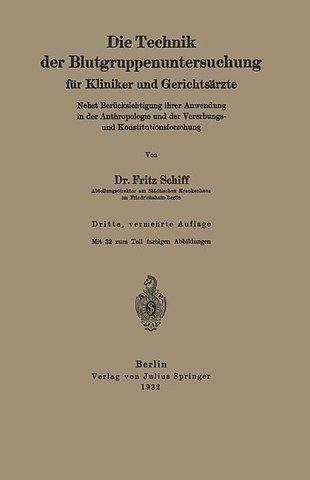 I. Die theoretischen Grundlagen der Blutgruppenbestimmung (Landsteinersche Reaktion [LaR]).- 1. Isohämagglutination.- 2. Unterscheidung zweier Blutarten auf Grund direkter Mischung.- 3. Unterscheidung zweier Blutarten auf Grund der Gruppeneinteilung desmenschlichen Blutes.- 4. Grundlagen der Gruppeneinteilung.- 5. Grundsätze für die Bestimmung der Blutgruppe.- a)Gruppenbestimmung mit Hilfe bekannter Sera.- b)Gruppenbestimmung mit Hilfe bekannter Blutkörperchen.- c)Gruppenbestimmung mit Hilfe von Blutkörperchen und Serum einer einzigen bekannten Gruppe.- 6. Konstanz der Blutgruppe.- 7. Vererbung der Gruppenzugehörigkeit.- Anhang; Die Unterteilung der A.-Eigenschaft.- II. Die Technik der Blutgruppenuntersuchung.- A. Allgemeine Technik.- 1. Das Testblut.- a) Die Auffindung der Testtypen A und B.- ?) Das erstmalige Aufsuchen der Testtypen.- ?) Die Ergänzung des Vorrates an Testblut.- b) Auswahl der geeignetsten Testproben.- ?) Auswahl, starker Testsera.- ?) Auswahl empfindlicher Blutkörperchen.- c) Aufbewahrung des Testblutes.- ?) Serum.- ?) Blutkörperchen.- 2. Das zu untersuchende Blut.- a) Blutentnahme.- ?) Venenpunktion.- ?) Entnahme aus dem Ohrläppchen.- b) Das Blutserum.- c) Die Blutkörperchen.- 3. Technik der Serum-Blutkörperchenmischung.- a) Die Reagensglasprobe als Methode der Wahl.- ?) Das Zentrifugieren.- ?) Die Reagensgläser.- ?) Temperatur.- b) Objektträgermethoden.- ?) Verfahren nach Moss-Lee-Vincent.- ?) Das Deckglasverfahren nach Lattes.- 4. Fehlerquellen, Kontrollen.- a) Fälschlich positive Ablesungen.- b) Fälschlich negative Ablesungen.- c) Abweichungen vom Gruppenschema.- B. Spezielle Technik der Blutgruppenuntersuchung.- 1. Blutuntersuchung für klinische Zwecke (Auswahl von Spendern für Bluttransfusionen oder Gewebsüberpflanzungen.- a) Prinzip.- b) Spezielle serologische Gesichtspunkte.- c) Anforderungen an die Technik.- d) Ausführung der Blutuntersuchung.- ?) Die „dreifache Probe“ als Schema der vollständigen Untersuchung.- ?) Abänderungen der Technik unter besonderen Verhältnissen.- Anhang: Die Bereithaltung von Blutspendern.- 2. Blutuntersuchungen zu gerichtlichen Zwecken.- a) Prinzip.- b) Vorbedingung für die Untersuchung.- c) Anforderungen an die Technik.- d) Besonderheiten der Technik je nach der Beschaffenheit des Untersuchungsmaterials.- ?) Frisches Blut.- ?) Verändertes Blut.- ?) Anderes Material als Blut.- e) Die speziellen Anwendungsgebiete.- ?) Untersuchung der Herkunft einer Blutprobe.- ?) Die Isoagglutinationsprobe bei strittiger Abstammung.- f) Anhang: Veröffentlichungen von Justizbehörden.- 3. Blutuntersuchung zu anthropologischen Zwecken.- a) Untersuchungen am Menschen.- ?) Gesichtspunkte für die Beschaffung des Materials, Listenführung.- ?) Anforderungen an die Technik.- ?) Ausführung der Untersuchung.- ?) Verwertung der Ergebnisse.- b) Untersuchungen an Affen.- 4. Die Blutgruppenuntersuchung als Hilfsmittel der Vererbungs- und Konstitutionsforschung.- a) Allgemeine Gesichtspunkte.- b) Ausführung der Untersuchung.- ?) Allgemeines.- ?) Die Technik der Blutuntersuchung.- III. Die neuen Blutkörpercheneigenschaften M, N und P von Landsteiner und Levine.- A. Die theoretischen Grundlagen.- 1. Allgemeines über den Nachweis typenspezifischer Bluteigenschaften mit Hilfe von Immunserum.- 2. Die einzelnen neuen Eigenschaften.- a) Die Bluteigenschaften M und N.- Konstanz, Einteilung in drei Klassen, Erblichkeit.- b) Die Blutkörpercheneigenschaft P.- B. Die Technik des Nachweises.- 1. Allgemeine Technik.- a) Die Eigenschaften M und N.- b) Die Blutkörpercheneigenschaft P.- 2. Spezielle Technik: Untersuchung auf M und N zu praktischen Zwecken (Abstammungsprüfung).- a) Anwendungsmöglichkeiten.- b) Untersuchungstechnik.- ?) Kontrolle der Reagenzien.- ?) Ausführung der Untersuchung.- c) Die Verwertung der Befunde zur Abstammungsprüfung.- ?) Prinzip des Verfahrens.- ?) Die einzelnen Anwendungsmöglichkeiten.