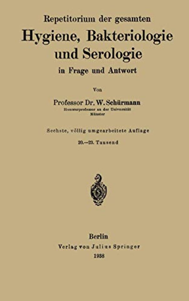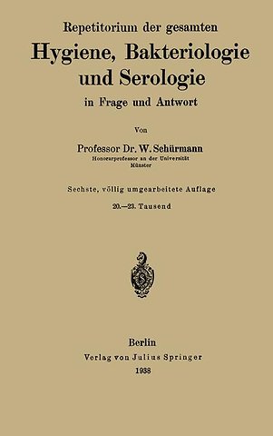 Hygiene.- Die klimatischen Einflüsse.- Luftdruck.- Luftbewegung.- Luftfeuchtigkeit.- Lufttemperatur.- Niederschläge und Sonnenstrahlung.- Klima.- Luft.- Chemisches Verhalten.- Luftstaub.- Boden.- Mechanische Struktur der Bodenschichten.- Temperatur und chemisches Verhalten des Bodens, die Bodenluft.- Verhalten des Wassers im Boden, die Mikroorganismen des Bodens.- Wasser.- Beschaffenheit, hygienische Anforderungen und Untersuchungsmethoden.- Wasserversorgung.- Ernährung und Nahrungsmittel.- Eiweißstoffe.- Fette.- Kohlenhydrate.- Wasser.- Salze.- Die akzessorischen Nährstoffe.- Nährstoffmengen.- Milch.- Molkereiprodukte.- Eier.- Fleisch.- Vegetabilische Nahrungsmittel.- Genuß- und Reizmittel.- Kleidung und Hautpflege, Haar- und Bartpflege, Zahnpflege, Leibes übungen.- Wohnung.- Heizung.- Ventilation.- Entstäubung.- Beleuchtung.- Abfallstoffe.- Leichenwesen.- Die hygienische Fürsorge für Kinder und Kranke.- Gewerbehygiene und Berufskrankheiten.- Rassenhygiene.- Bakteriologie einschließlich Serologie.- Allgemeines über Morphologie und Biologie der Bakterien.- Form der Bakterien.- Bau der Bakterien.- Vermehrung der Bakterien und Lebensbedingungen der Bakterien.- Lebensäußerungen der Bakterien.- Untersuchungsmethoden.- Apparate.- Arbeitsplatz.- Untersuchung der Bakterien: a) im ungefärbten Präparat.- Untersuchung der Bakterien: b) im gefärbten Präparat.- Anfertigung von Blutpräparaten.- Anfertigung von Tuschepräparaten.- Untersuchung im Dunkelfeld.- Untersuchung im Klatschpräparat.- Die gebräuchlichsten Färbemethoden.- Einfache Färbung.- Gramfärbung.- Tuberkel-bacillenfärbung (Ehrlich-Ziel-Neelsen) und Sporenfärbung.- Diphtheriebacillenfärbung (M. Neißer).- Giemsafärbung.- Mansonfärbung.- Sterilisation.- Von Glasgeräten und Metallgegenständen.- Von Gummisachen.- Von Flüssigkeiten.- Von Nährsubstraten.- Nährsubstrate.- Fleischwasser und Nährbouillon.- Nähragar.- Fuchsin-Sulfit-Nährboden nach Endo.- Lackmus- Milchzucker-Nutroseagar nach v.Drigalski und Conradi.- Malachitgrünagar.- Löfflers Blutserum und Blutserumnährböden.- Blutagar, Ascitesagar, Eier, Kartoffeln, Brot, Milch.- Plattenverfahren, Keimgehaltsbestimmung, Einzelkultur.- Tierversuch.- A. Die pathogenen Bakterien.- I. Die pathogenen Kokken.- 1. Staphylokokken und Streptokokken.- 2. Pneumo-coccus (Diplococcuslanceolatus).- 3. Gonococcus.- 4. Meningococcus.- 5. Micrococcus tetragenus.- I. Die pathogenen Bacillen.- 1. Der Milzbrandbacillus.- 2. Tetanusbacillus.- 3. Erreger der Gasödeminfektionen.- 4. Bacillus botulinus.- 5. Bacillus pyocyaneus.- 6. Bacillus typhi abdominalis.- 7. Paratyphusbacillen und Enteritis gruppe.- 8. Bacterium coli.- 9. Ruhrbacillen.- 10. Pathogene Kapselbacillen.- 11. Gruppe der hämorrhagischen Septicämie: a) Der Pestbacillus.- b) Pasteurella-Bacillen.- c) B. tularense und die Tularämie.- 12. Gruppe der hämoglobinophilen Bacillen a) Influen- zabacillus, Bacillus conjunktivitidis Koch-Weeks.- b) Keuchhustenbacillus.- c) Der Ulcus molle-Bacillus.- 13. Bacillus des Schweinerotlaufs.- 14. Brucellosis (Micrococcus melitensis, Bazillus abortus Bang, Brucella suis).- Diphtherideen.- 15. Bacillus diphtheriae.- 16. Bacillus mallei.- Säurefeste Bacillen.- 17. Tuberkelbacillen.- 18. Bacillus leprae.- III. Pathogene Vibrionen.- Choleravibrionen.- B. Pathogene Streptotricheen.- Aktinomyzeten.- C. Pathogene Sproß- und Schimmelpilze.- D. Spirochäten.- 1. Spirochäten des Rückfallfiebers.- 2. Spirochaeta pallida einschl. Komplementbindungsreaktion nach v.Wasser-mann, Sachs-Georgischer und Meinicke’scher Reaktion.- 3. Spirochaeta icterogenes.- 4. Spirochäten bei Plaut-Vincent scher Angina.- 5. Rattenbißkrank- heit.- 6. Frambösie.- E. Krankheitserregende Protozoen.- 1. Dysenterieamöben.- 2. Trypanosomen.- 3. Kala-Azar., die Orient- oder Aleppo-Beule.- 4. Ma-lariaplasmodien.- F. Krankheiten, die durch ultramikroskopischeKrankheitserreger hervorgerufen werden.- 1.Pocken.- 2. Hundswut.- 3. GelbfieberS..- 4. Psittacosis.- 5. Poliomyelitis acuta.- 6. Maul- und Klauenseuche.- 7. Trachom.- Fleckfieber.- Desinfektion.- Die Entwesung.- Gesetzliche Maßnahmen zur Bekämpfung ansteckender Krankheiten.- Einige der gebräuchlichen Fachausdrücke in der Immunitätslehre.