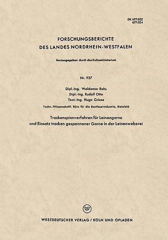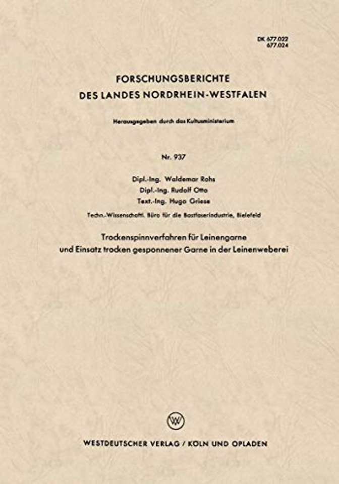 Gliederung.- 1. Aufgabenstellung und Durchführung der Untersuchungen.- 2. Spinnverfahren.- 3. Spinnversuche.- 4. Ergebnisse der Spinnversuche.- 5. Eignungsprüfung der Garne in der Weberei.- 6. Ergebnisse der Webversuche.- 7. Vor- und Nachteile bei Herstellung und Einsatz naß- und trockengesponnener Leinengarne.- 8. Zusammenfassung.