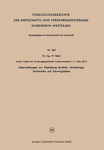 Gliederung.- II. Einleitung.- III. Ursachen der Siebleistungsabnahme infolge Feuchtigkeit.- 1. Wasserbindungen im Haufwerk.- 2. Kraftwirkungen im Haufwerk durch zwickelkapillare Flüssigkeit.- 3. Elektrische Kraftwirkungen im feuchten Kornverband.- 4. Reibungskräfte bei der Absiebung feuchten Gute.- 5. Molekulare Kraftwirkungen.- IV. Die Feuchtsiebung.- 1. Die Versuchsanlagen.- 2. Versuchsdurchführung und -auswertung.- 3. Vorgänge in den Siebmaschen.- 4. Vorgänge auf dem Sieb.- V. Zusammenfassung.- VI. Literaturverzeichnis.- VII. Anhang mit Diagrammen.