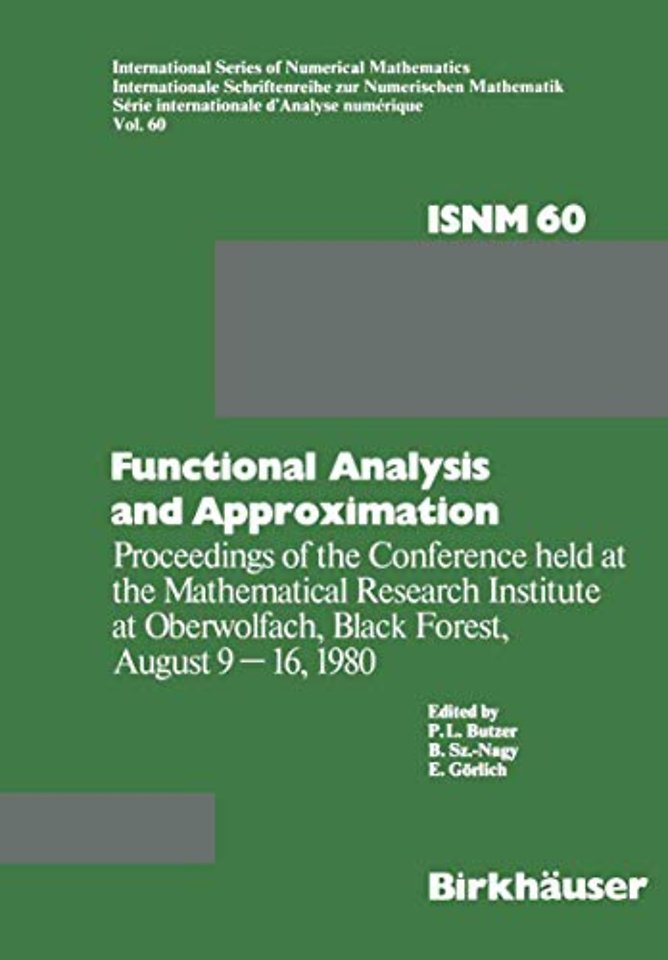 Zur Tagung.- List of participants.- Program of the Sessions.- Jacob Lionel Bakst Cooper — in memoriam.- A testimony from a friend.- I Operator Theory.- Fixed points of certain maps on positive semidefinite operators.- A remark on the spectral bound of the generator of semigroups of positive operators with applications to stability theory.- Local operators, regular sets, and evolution equations of diffusion type.- An outline of the spectral theory of propagators.- On generalized inverses and operator ranges.- II Functional Analysis.- Modular approximation by a filtered family of linear operators.- Interpolation between H1 and L?.- The Franklin orthogonal system as unconditional basis in ReH1 and VMO.- III Abstract Harmonic Analysis.- Bessel potential spaces and generalized Lipschitz spaces on local fields.- On the minimum norm property of the Fourier projection in L1-spaces.- Banach spaces of distributions of Wiener’s type and interpolation.- Approximation theory on the compact solenoid.- IV Fourier Analysis and Integral Transforms.- J. Szabados: Bernstein and Markov type estimates for the derivative of a polynomial with real zeros.- Projections with norms smaller than those of the ultraspherical and Laguerre partial sums.- The regular convergence of multiple series.- Norm inequalities relating the Hilbert transform to the Hardy-Littlewood maximal function.- Best approximation on the unit sphere in Rk.- V Best Approximation.- Ein Problem über die beste Approximation in Hilberträumen.- Über Existenz- und Eindeutigkeitsmengen bei der besten Ko-Approximation.- Inverse approximation theorems of Lebedev and Tamrazov.- Best multipoint local approximation.- VI Approximation by Linear Operators.- On the Lebesgue function of interpolation.- A uniform boundedness principle with rates and an application to linear processes.- Slow approximation with convolution operators.- A remark on asymptotically optimal approximation by Faber series.- VII Strong and Miintz Approximation.- Strong approximation and generalized Lipschitz classes.- Strong approximation and the behaviour of Fourier series.- On the rate of approximation by Müntz polynomials satisfying constraints.- VIII Number Theory and Probability.- The asymptotic distribution of lattice points in Euclidean and non-Euclidean spaces.- On the approximation of indicator functions by smooth functions in Banach spaces.- On the o-closeness of the distribution of two weighted sums of Banach space valued martingales with applications.- IX Splines and Numerical Integration.- Approximation und Transformationsmethoden III.- Uniqueness of optimal piecewise polynomial L1 approximations for generalized convex functions.- The dominated integral of functions of two variables.- Bernstein-Polynome, 1912–1955.- New and unsolved problems.- Errata.- Alphabetical list of papers.- Mathematics subject classification numbers.- Key words and phrases.