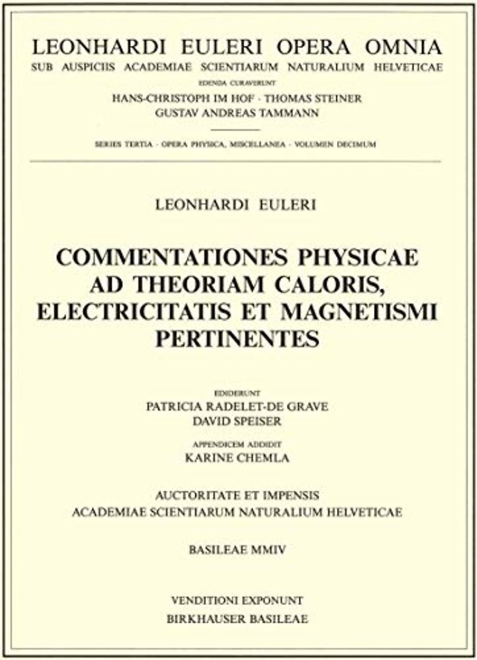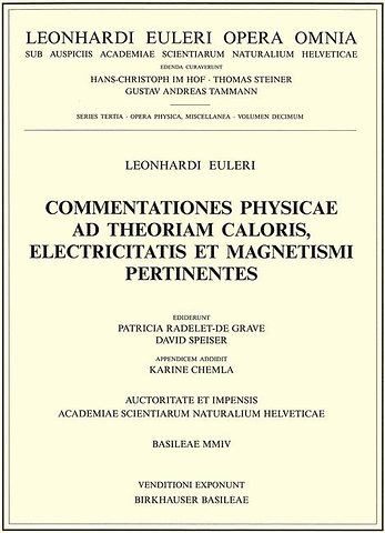 This volume contains eleven articles, seven of them written by Leonhard Euler himself (4 contributions in Latin, 3 in French) and four written by his son Johann Albrecht Euler (3 contributions inFrench,1 in Latin). Four of the papers are prized essays submitted to the Académie Royale des Sciences in Paris and to the Imperial Academy in St. Petersburg. There are three articles on heat, two on matters of electricity and six articles on magnetism. The extensive introduction, written in English, is divided into the parts thermodynamics, electricity, magnetism, and several comments and appendices on Euler's "Anleitung zur Naturlehre", on Euler's summery of Aepinius' paper on electricity, and Euler's work in spherical trigonometry.