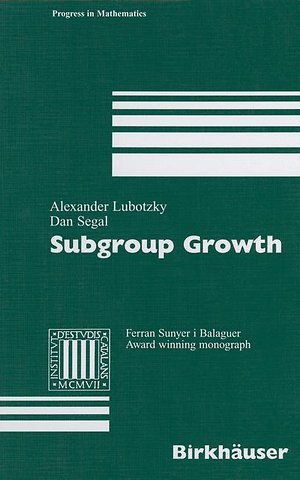 0 Introduction and Overview.- 0.1 Preliminary comments and definitions.- 0.2 Overview of the chapters.- 0.3 On CFSG.- 0.4 The windows.- 0.5 The ‘notes’.- 1 Basic Techniques of Subgroup Counting.- 1.1 Permutation representations.- 1.2 Quotients and subgroups.- 1.3 Group extensions.- 1.4 Nilpotent and soluble groups.- 1.5 Abelian groups I.- 1.6 Finite p-groups.- 1.7 Sylow’s theorem.- 1.8 Rest riet ing to soluble subgroups.- 1.9 Applications of the ‘minimal index’.- 1.10 Abelian groups II.- 1.11 Growth types.- Notes.- 2 Free Groups.- 2.1 The subgroup growth of free groups.- 2.2 Subnormal subgroups.- 2.3 Counting d-generator finite groups.- Notes.- 3 Groups with Exponential Subgroup Growth.- 3.1 Upper bounds.- 3.2 Lower bounds.- 3.3 Free pro-p groups.- 3.4 Normal subgroups in free pro-p groups.- 3.5 Relations in p-groups and Lie algebras.- Notes.- 4 Pro-p Groups.- 4.1 Pro-p groups with polynomial subgroup growth.- 4.2 Pro-p groups with slow subgroup growth.- 4.3 The groups $$SL_r^1({\mathbb{F}_p}[[t]])$$.- 4.4 A-perfect groups.- 4.5 The Nottingham group.- 4.6 Finitely presented pro-p groups.- Notes.- 5 Finitely Generated Groups with Polynomial Subgroup Growth.- 5.1 Preliminary observations.- 5.2 Linear groups with PSG.- 5.3 Upper chief factors.- 5.4 Groups of prosoluble type.- 5.5 Groups of finite upper rank.- 5.6 The degree of polynomial subgroup growth.- Notes.- 6 Congruence Subgroups.- 6.1 The characteristic 0 case.- 6.2 The positive characteristic case.- 6.3 Perfect Lie algebras.- 6.4 Normal congruence subgroups.- Notes.- 7 The Generalized Congruence Subgroup Problem.- 7.1 The congruence subgroup problem.- 7.2 Subgroup growth of lattices.- 7.3 Counting hyperbolic manifolds.- Notes.- 8 Linear Groups.- 8.1 Subgroup growth, characteristic 0.- 8.2 Residually nilpotent groups.- 8.3 Subgroup growth, characteristic p.- 8.4 Normal subgroup growth.- Notes.- 9 Soluble Groups.- 9.1 Metabelian groups.- 9.2 Residually nilpotent groups.- 9.3 Some finitely presented metabelian groups.- 9.4 Normal subgroup growth in metabelian groups.- Notes.- 10 Profinite Groups with Polynomial Subgroup Growth.- 10.1 Upper rank.- 10.2 Profinite groups with wPSG: structure.- 10.3 Quasi-semisimple groups.- 10.4 Profinite groups with wPSG: characterization.- 10.5 Weak PSG = PSG.- Notes.- 11 Probabilistic Methods.- 11.1 The probability measure.- 11.2 Generation probabilities.- 11.3 Maximal subgroups.- 11.4 Further applications.- 11.5 Pro-p groups.- Notes.- 12 Other Growth Conditions.- 12.1 Rank and bounded generation.- 12.2 Adelic groups.- 12.3 The structure of finite linear groups.- 12.4 Composition factors.- 12.5 BG, PIG and subgroup growth.- 12.6 Residually nilpotent groups.- 12.7 Arithmetic groups and the CSP.- 12.8 Examples.- Notes.- 13 The Growth Spectrum.- 13.1 Products of alternating groups.- 13.2 Some finitely generated permutation groups.- 13.3 Some profinite groups with restricted composition factors.- 13.4 Automorphisms of rooted trees.- Notes.- 14 Explicit Formulas and Asymptotics.- 14.1 Free groups and the modular group.- 14.2 Free products of finite groups.- 14.3 Modular subgroup arithmetic.- 14.4 Surface groups.- Notes.- 15 Zeta Functions I: Nilpotent Groups.- 15.1 Local zeta functions as p-adic integrals.- 15.2 Alternative methods.- 15.3 The zeta function of a nilpotent group.- Notes.- 16 Zeta Functions II: p-adic Analytic Groups.- 16.1 Integration on pro-p groups.- 16.2 Counting subgroups in a p-adic analytic group.- 16.3 Counting orbits.- 16.4 Counting p-groups.- Notes.- Windows.- 1 Finite Group Theory.- 1 Hall subgroups and Sylow bases.- 2 Carter subgroups.- 3 The Fitting subgroup.- 4 The generalized Fitting subgroup.- 5 Tate’s theorem.- 6 Rank and p-rank.- 7 Schur multiplier.- 8 Powerful p-groups.- 9 GLn and Sym(n).- 2 Finite Simple Groups.- 1 The list.- 2 Generators.- 3 Subgroups.- 4 Representations.- 5 Automorphisms.- 6 Schur multipliers.- 7 An elementary proof.- 3 Permutation Groups.- 1 Primitive groups.- 2 Groups with restricted sections.- 3 Subgroups of alternating groups.- 4 Profinite Groups.- 1 Completions.- 2 Free profinite groups.- 3 Profinite presentations.- 5 Pro-p Groups.- 1 Generators and relations.- 2 Pro-p groups of finite rank.- 3 Linear pro-p groups over local fields.- 4 Automorphisms of finite p-groups.- 5 Hall’s enumeration principle.- 6 Soluble Groups.- 1 Nilpotent groups.- 2 Soluble groups of finite rank.- 3 Finitely generated metabelian groups.- 7 Linear Groups.- 1 Soluble groups.- 2 Jordan’s theorem.- 3 Monomial groups.- 4 Finitely generated groups.- 5 Lang’s theorem.- 8 Linearity Conditions for Infinite Groups.- 1 Variations on Mal’cev’s local theorem.- 2 Groups that are residually of bounded rank.- 3 Applications of Ado’s theorem.- 9 Strong Approximation for Linear Groups.- 1 A variant of the Strong Approximation Theorem.- 2 Subgroups of SLn(Fp).- 3 The ‘Lubotzky alternative’.- 4 Strong approximation in positive characteristic.- 10 Primes.- 1 The Prime Number Theorem.- 2 Arithmetic progressions and the Bombieri-Vinogradov theorem.- 3 Global fields and Chebotarev’s theorem.- 11 Probability.- 12 p-adic Integrals and Logic.- 1 Results.- 2 A peek inside the black box.- Open Problems.- 1 ‘Growth spectrum’.- 2 Normal subgroup growth in pro-p groups and metabelian groups.- 3 The degree of f.g. nilpotent groups.- 4 Finite extensions.- 5 Soluble groups.- 6 Isospectral groups.- 7 Congruence subgroups, lattices in Lie groups.- 8 Other growth conditions.- 9 Zeta functions.