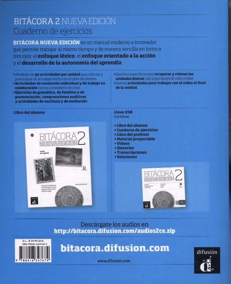 "Bitácora 2 nueva edición is een moderne en innovatieve methode die de mogelijkheid biedt om op een duidelijke en gemakkelijke wijze op drie verschillende onderdelen tegelijk vooruitgang te boeken: de woordenschatverwerving, het actieve taalgebruik en de ontwikkeling van het zelfstandig taalgebruik.
