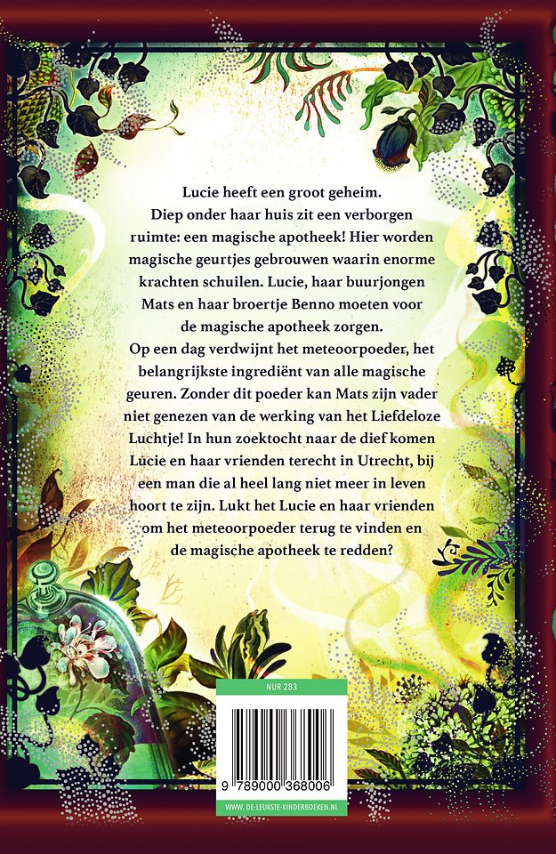 Op een dag verdwijnt het meteoorpoeder, het belangrijkste ingrediënt van alle magische geuren. Zonder dit poeder kan Mats zijn vader niet genezen van de werking van het liefdeloze luchtje! In hun zoektocht naar de dief komen Lucie en haar vrienden terecht in Utrecht. Daar krijgen ze hulp van een man die al heel lang niet meer in leven hoort te zijn. Lukt het Lucie en haar vrienden om het meteoorpoeder te vinden en de magische apotheek te redden?Deel 2 in een spannende serieOm zelf te lezen vanaf 9 jaar, maar ook fantastisch om voor te lezen Een magische setting, een avontuurlijk verhaal en een stoere heldin!