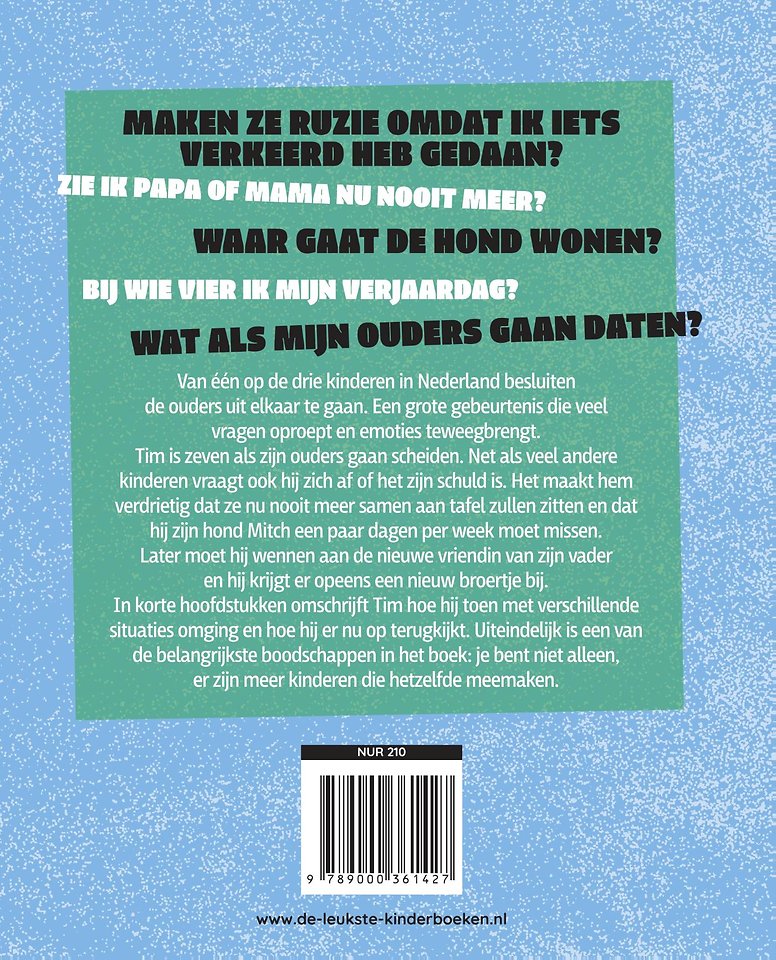 Van één op de drie kinderen in Nederland besluiten de ouders uit elkaar te gaan. Een grote gebeurtenis die veel vragen oproept en emoties teweegbrengt. Tim is zeven als zijn ouders gaan scheiden. Net als veel andere kinderen vraagt ook hij zich af of het zijn schuld is. Hij is verdrietig dat ze nu nooit meer samen aan tafel zullen zitten en dat hij zijn hond Mitch een paar dagen per week moet missen. Later moet hij wennen aan de nieuwe vriendin van zijn vader en de dates van zijn moeder, en hij krijgt er opeens een nieuw broertje bij.