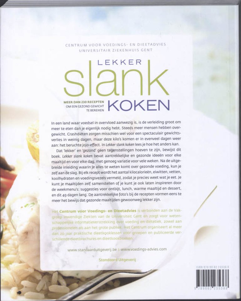 Dat lekker en gezond geen tegenstellingen hoeven te zijn bewijst dit boek. Lekker slank koken bevat aantrekkelijke en gezonde ideeën voor elke maaltijd en voor elke dag, met genoeg variatie voor vele weken. Na de uitgebreide inleiding waarin je alles te weten komt over gezonde voeding kun je zelf aan de slag. Bij elk recept wordt het aantal kilocalorieën, eiwitten, vetten, koolhydraten en voedingsvezels vermeld, zodat je precies weet wat je eet. Je kunt je maaltijden zelf samenstellen of je laten inspireren door de weekmenu's: suggesties voor ontbijt, lunch, warme maaltijd en dessert, en dit negenenveertig dagen lang. De aantrekkelijke foto's bij de recepten vormen eens te meer het bewijs dat gezonde maaltijden gewoonweg lekker zijn.
