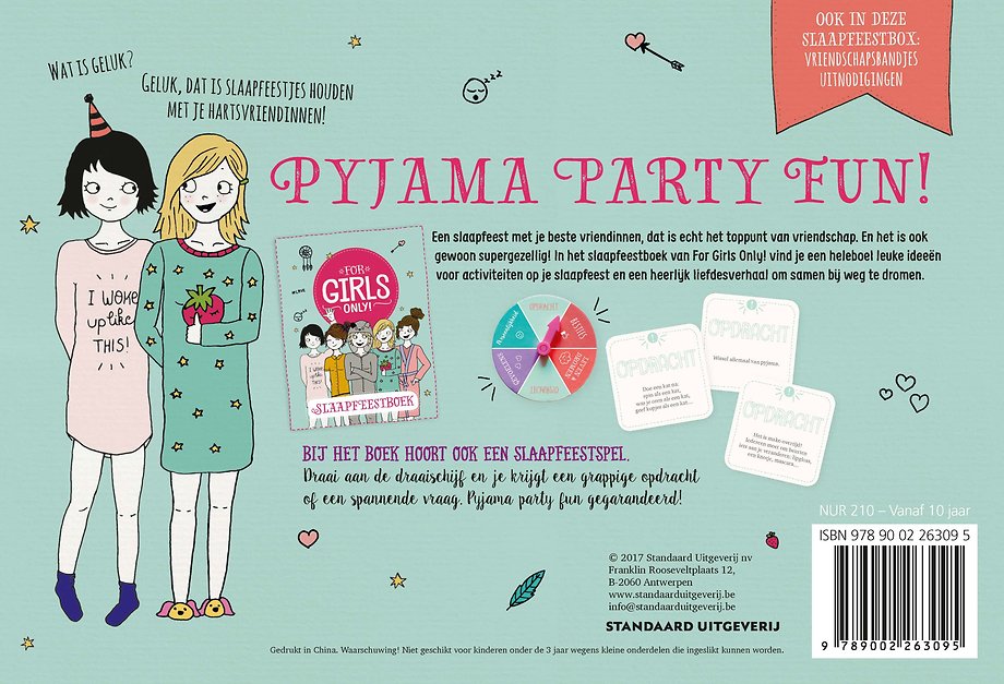 Pyjama party fun! Een slaapfeest met je beste vriendinnen, dat is echt het toppunt van vriendschap. En het is ook gewoon supergezellig! In het slaapfeestboek van For Girls Only! vind je een heleboel leuke ideeën voor activiteiten op je slaapfeest en een heerlijk liefdesverhaal om samen bij weg te dromen. Bij het boek hoort ook een slaapfeestspel. Draai aan de draaischijf en je krijgt een grappige opdracht of een spannende vraag. Pyjama party fun gegarandeerd!