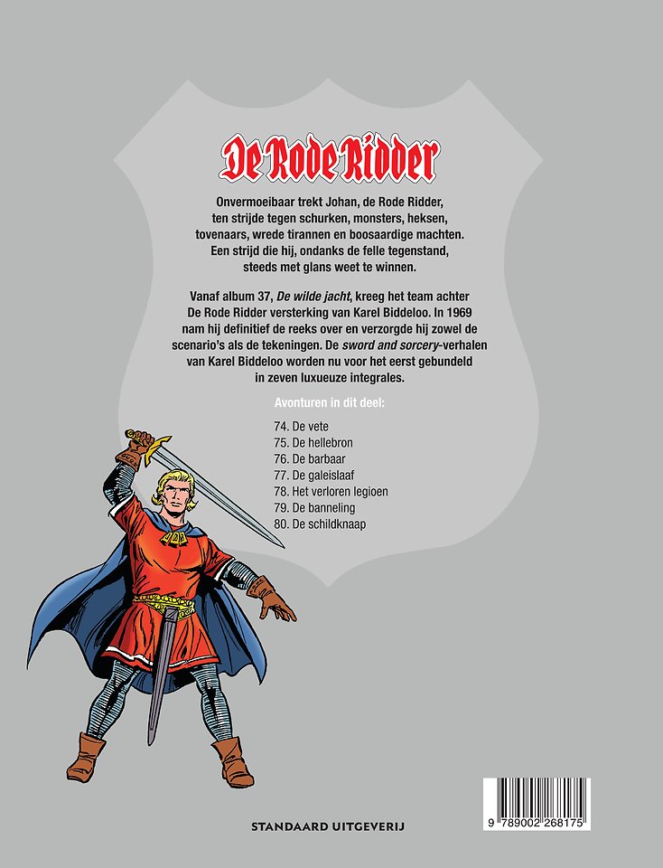 Onvermoeibaar trekt Johan, de Rode Ridder, ten strijde tegen schurken, monsters, heksen, tovenaars, wrede tirannen en boosaardige machten. Een strijd die hij, ondanks de felle tegenstand, steeds met glans weet te winnen. Vanaf album 37, De wilde jacht, kreeg het team achter De Rode Ridder versterking van Karel Biddeloo. In 1969 nam hij definitief de reeks over en verzorgde hij zowel de scenario's als de tekeningen. Deze integrale bevat: De Vete, De Hellebron, De Barbaar, De Galeislaaf, Het Verloren Legioen, De Banneling en De schildknaap.