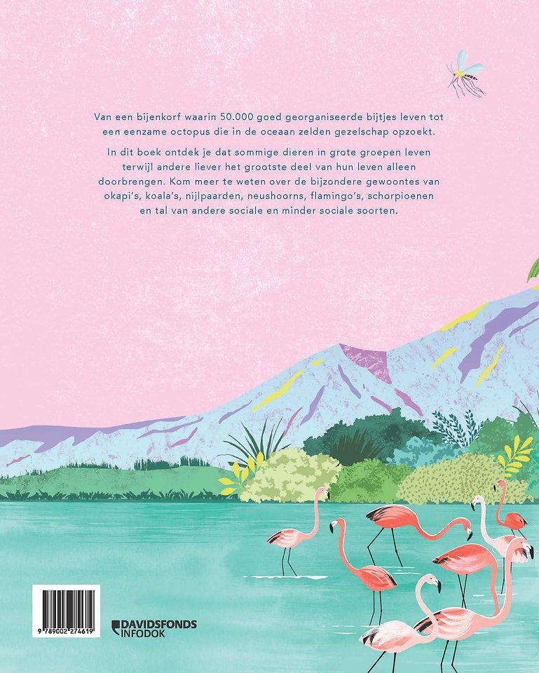 In dit boek ontdek je dat sommige dieren in grote groepen leven terwijl andere liever het grootste deel van hun leven alleen doorbrengen. Kom meer te weten over de bijzondere gewoontes van okapi’s, koala’s, nijlpaarden, neushoorns, flamingo’s, schorpioenen en tal van andere sociale en minder sociale soorten.