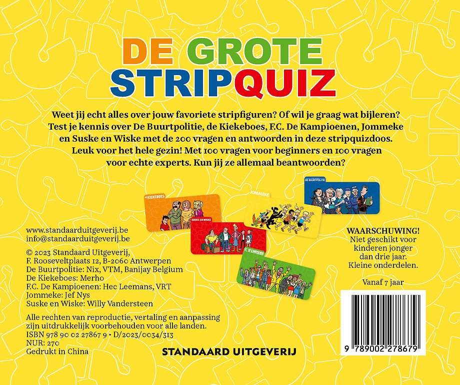 Weet jij echt alles over jouw favoriete stripfiguren? Of wil je graag wat bijleren? Test je kennis over De Buurtpolitie, de Kiekeboes, F.C. De Kampioenen, Jommeke en Suske en Wiske met de 200 vragen en antwoorden in deze stripquizdoos. Leuk voor het hele gezin! Met 100 vragen voor beginners en 100 vragen voor echte experts. Kun jij ze allemaal beantwoorden?