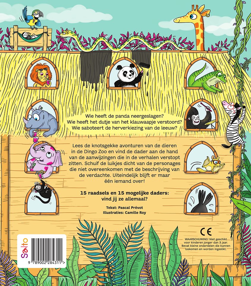 Lees de knotsgekke avonturen van de dieren in de Dingo Zoo en vind de dader aan de hand van de aanwijzingen die in de verhalen verstopt zitten. Schuif de luikjes dicht van de personages die niet overeenkomen met de beschrijving van de verdachte. Uiteindelijk blijft er maar één iemand over!