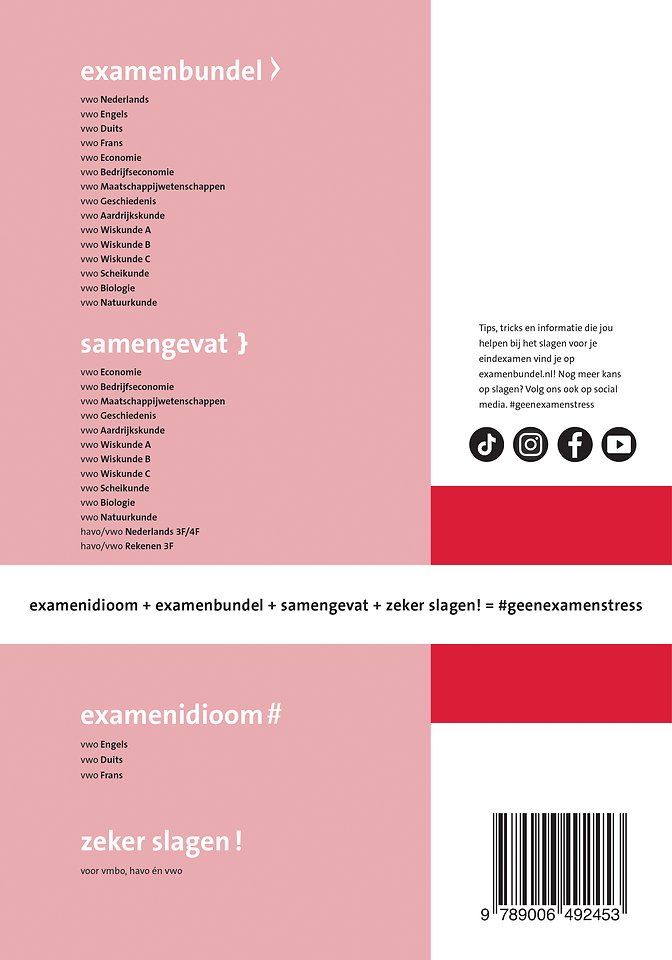 Met Samengevat vwo Biologie weet je precies wat je moet kennen en bereid je je zelfstandig voor op het examen. Gecombineerd met Examenbundel vwo Biologie vormt Samengevat al 45 jaar de beste voorbereiding op het examen. Je vindt de theorie in Samengevat en je oefent met de opgaven uit de Examenbundel. Het boek Zeker Slagen! helpt je daarnaast om efficiënt te leren en te plannen.