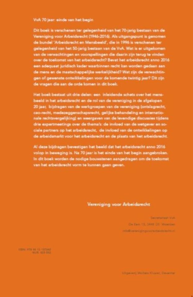 Dit boek is verschenen ter gelegenheid van het 70-jarig bestaan van de Vereniging voor Arbeidsrecht (1946-2016). Als uitgangspunt is genomen de bundel ‘Arbeidsrecht en Mensbeeld’, die in 1996 is verschenen ter gelegenheid van het 50-jarig bestaan van de VvA. Wat is er uitgekomen van de verwachtingen en voorspellingen die daarin zijn terug te vinden over de toekomst van het arbeidsrecht? Bevat het arbeidsrecht anno 2016 een adequaat juridisch kader waarbinnen recht kan worden gedaan aan de mens en de maatschappelijke werkelijkheid? Wat zijn de verwachtingen of gewenste ontwikkelingen voor de komende twintig jaar? Dit zijn de vragen die aan de orde komen in dit boek.