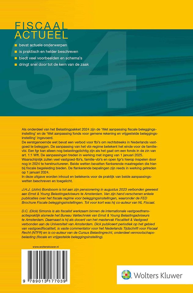 In Een gewijzigd fiscaal regime voor beleggingsinstellingen en (familie)fondsen worden de ingrijpende wijzigingen per 1 januari 2025 voor de vastgoed-fbi, de familie-vbi en de familie-fgr, zowel voor de instelling als voor de deelnemers, beschreven. De flankerende maatregelen die het mogelijk maken om in 2024 te anticiperen op de wijzigingen worden besproken en bieden een gelangrijke ondersteuning voor de adviespraktijk.