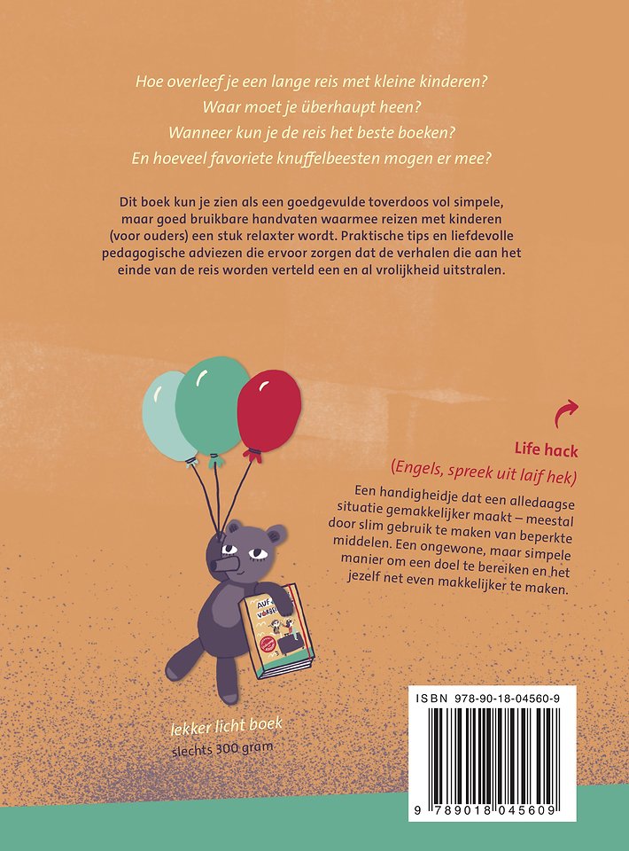 Life hacks voor op reis met kinderen Hoe overleef je een lange reis met kleine kinderen? Waar moet je überhaupt heen? Wanneer kun je de reis het beste boeken? En hoeveel favoriete knuffelbeesten mogen er mee? Dit boek kun je zien als een goedgevulde toverdoos vol simpele, maar goed bruikbare handvaten waarmee reizen met kinderen (voor ouders) een stuk relaxter wordt. Praktische tips en liefdevolle pedagogische adviezen die ervoor zorgen dat de verhalen die aan het einde van de reis worden verteld een en al vrolijkheid uitstralen. Extra licht boek, slechts 300 gram. Handig voor op reis. Formaat 148 x 205 mm Omvang 144 pagina’s ISBN 9789018045609