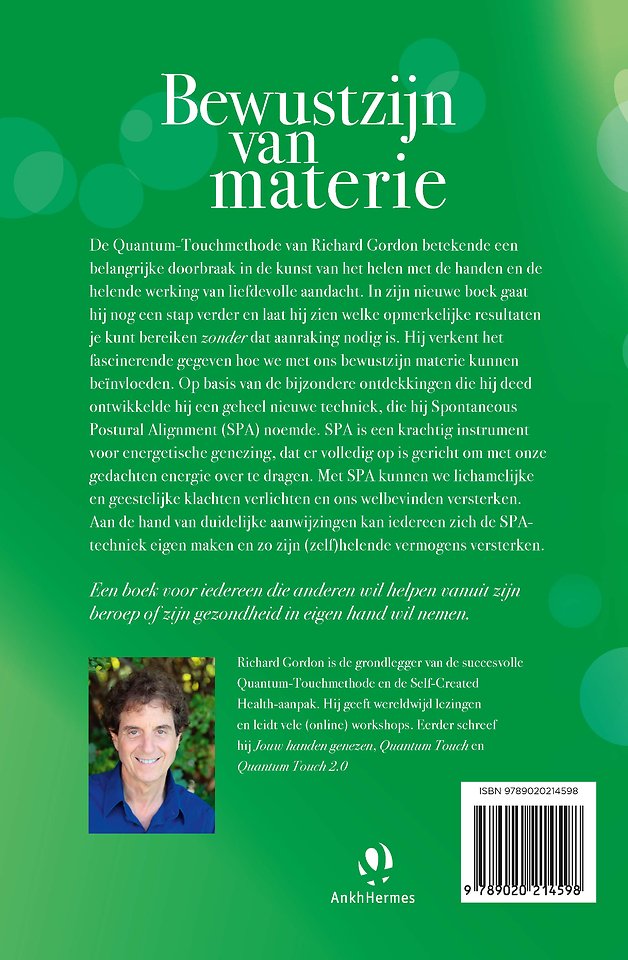'Bewustzijn van materie, over helen en overdraagbare energie' is het nieuwe meesterwerk van Richard Gordon, de grondlegger van de Quantum-Touch methode. Hij ontdekte dat hij, nadat hij de Quantum Touch methode gebruikte om cliënten te helpen bij het verlichten van klachten aan het bekken- en de ruggenwervel, nog veel verder kwam in het helingsproces door zijn bewuste aandacht op de cliënt te richten. Zonder de cliënt aan te raken of de suggestie te wekken iets te doen, was hij in staat om de conditie van het lichaam sterk te verbeteren. Gebaseerd op deze wetenschap ontwikkelde hij een nieuwe methode: SPA (Spontanious Postural Alignment). Zonder dat aanraking nodig is kunnen hiermee lichamelijke klachten worden verlicht en verholpen. In dit boek legt hij aan de hand van duidelijke stappen uit hoe deze techniek werkt. Met 57 voorbeelden van experimenten die je zelf ook eenvoudig kunt uitvoeren, heb je meteen het bewijs in handen dat het werkt. Iedereen kan de krachtige SPA-methode onder de knie krijgen en toepassen om zo zijn (zelf)helende vermogens te versterken. Dit boek biedt een fascinerend inzicht in de verbinding tussen ons bewustzijn en materie. We kunnen veel meer dan we denken!