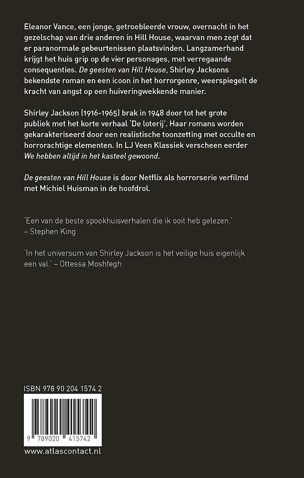 ‘De geesten van Hill House’, Shirley Jacksons bekendste roman en een icoon in het horrorgenre, weerspiegelt de kracht van angst op een huiveringwekkende manier. Eleanor Vance, een jonge, getroebleerde vrouw, overnacht in het gezelschap van drie anderen in Hill House, waarvan men zegt dat er paranormale gebeurtenissen plaatsvinden. Langzamerhand krijgt het huis grip op de vier personages, met verregaande consequentie. Jacksons romans worden gekarakteriseerd door een realistische toonzetting met occulte en horrorachtige elementen. ‘De geesten van Hill House’ is door Netflix verfilmd.