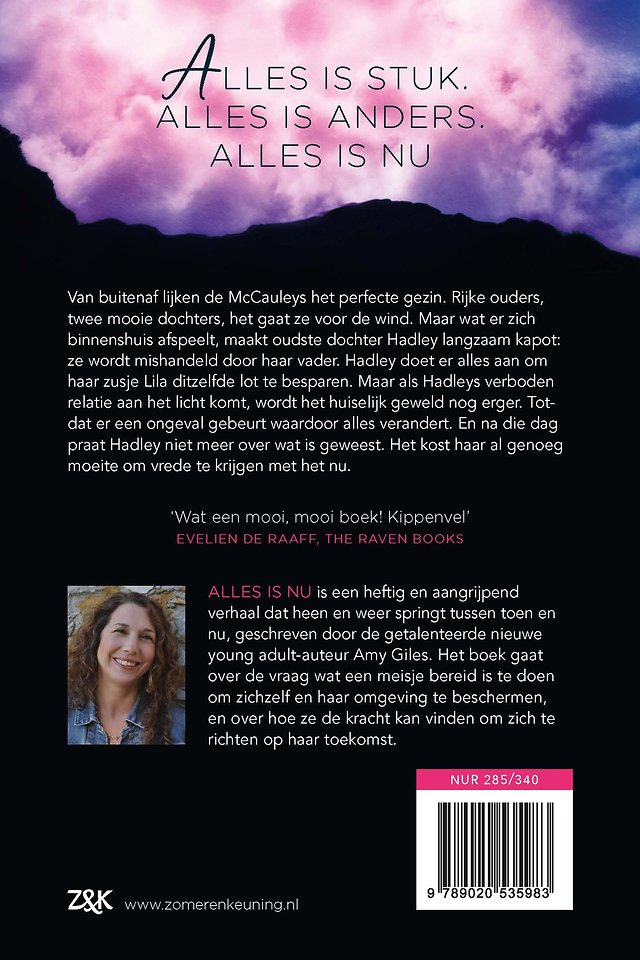 Amy Giles deelt een emotionele klap uit met ‘Alles is nu’. Het gezin waarin Hadley opgroeit lijkt perfect. Maar niets is wat het lijkt. Hadley is de oudste dochter en wordt mishandeld door haar vader. Ze doet er alles aan om haar zusje ditzelfde lot te besparen. Maar als Hadleys verboden relatie aan het licht komt, wordt het huiselijk geweld nog erger. Totdat er een ongeval gebeurt waardoor alles verandert. En na die dag praat Hadley niet meer over wat is geweest. Het kost haar al genoeg moeite om vrede te krijgen met het nu. ‘Alles is nu’ is een aangrijpende YA crossover van de talentvolle Amy Giles.