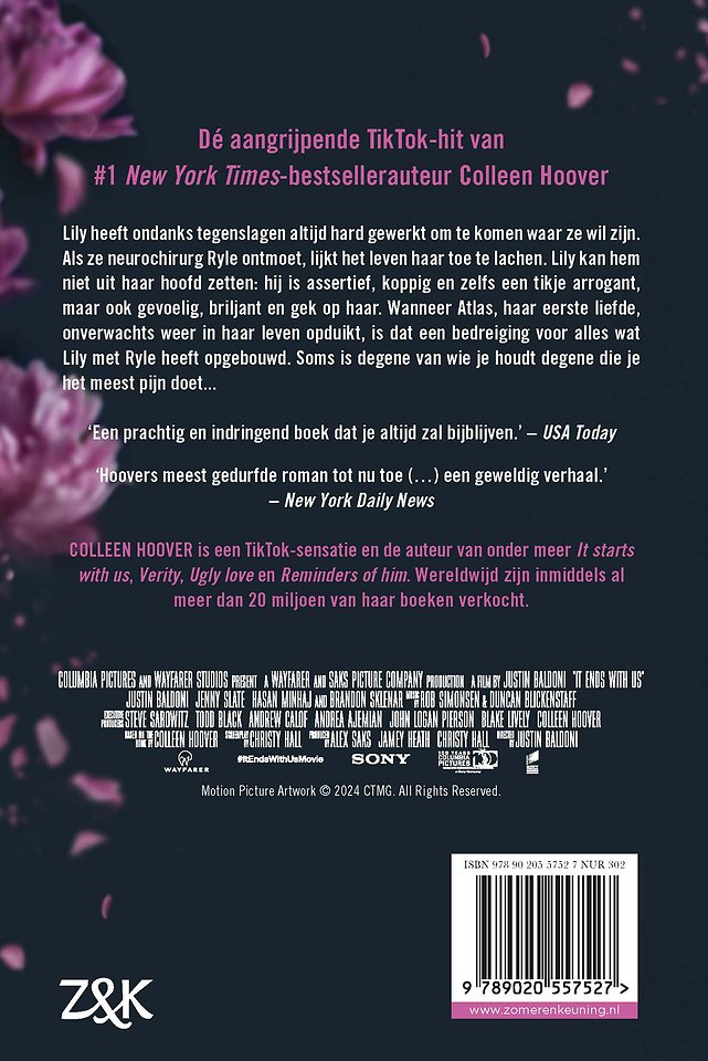 'It ends with us' is dé aangrijpende TikTok-hit van Colleen Hoover, de internationale bestellerauteur van 'Verity' en 'Ugly love'. Nu verfilmd met Blake Lively en Justin Baldoni in de hoofdrol!