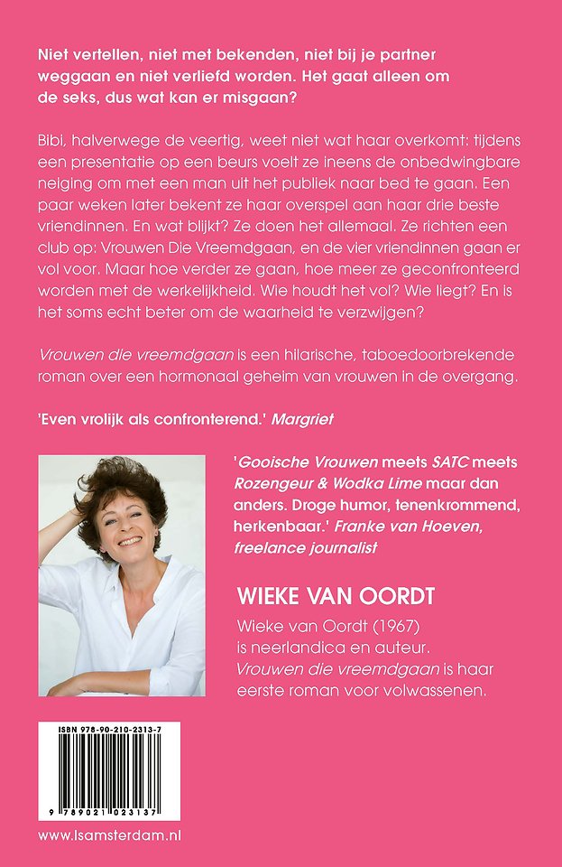 Vrouwen die vreemdgaan van Wieke van Oordt is een hilarische, taboedoorbrekende roman over een hormonaal geheim van vrouwen in de overgang. Bibi, halverwege de veertig, weet niet wat haar overkomt: tijdens een presentatie op een beurs voelt ze ineens de onbedwingbare neiging om met een man uit het publiek naar bed te gaan. Een paar weken later bekent ze haar overspel aan haar drie beste vriendinnen. En wat blijkt? Ze doen het allemaal. Ze richten een club op: Vrouwen Die Vreemdgaan, en ze maken regels: niet vertellen, niet met bekenden, niet bij je partner weggaan en niet verliefd worden. Het gaat alleen om de seks, dus wat kan er misgaan? De vier vriendinnen gaan er vol voor, maar hoe verder ze gaan, hoe meer ze geconfronteerd worden met de werkelijkheid. Wie houdt het vol? Wie liegt? En is het soms echt beter om de waarheid te verzwijgen?