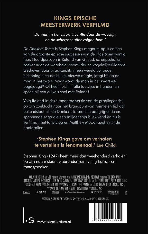 Volg Roland in deze moderne versie van de graallegende op zijn zoektocht naar het brandpunt van ruimte en tijd dat bekendstaat als de Donkere Toren. Een aangrijpende en spannende saga die een miljoenenpubliek vond en nu is verfilmd, met Idris Elba en Matthew McConaughey in de hoofdrollen.