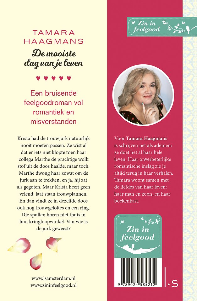 (POD) In De mooiste dag van je leven van Tamara Haagmans vindt Krista, medewerker bij een kringloopwinkel, in een oude doos een trouwjurk. Op aandringen van haar collega Marthe past ze de jurk en... hij zit als gegoten. Maar Krista heeft geen vriend, laat staan trouwplannen. Dan vindt ze in dezelfde doos ook nog trouwgeloftes en een ring. Van wie is de jurk geweest?