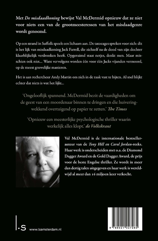 (POD)In Misdaadkoning van bestsellerauteur Val McDermid spoelt op een strand in Suffolk een lichaam aan. De tatoeages spreken voor zich: dit is het lijk van de misdaadkoning Jack Farrell, die zichzelf na de dood van zijn dochter klaarblijkelijk verdronken heeft. Opgeruimd staat netjes, denkt men. Maar misschien ook niet… Want vervolgens worden één voor één Jacks vijanden vermoord, op de meest gruwelijke manieren.