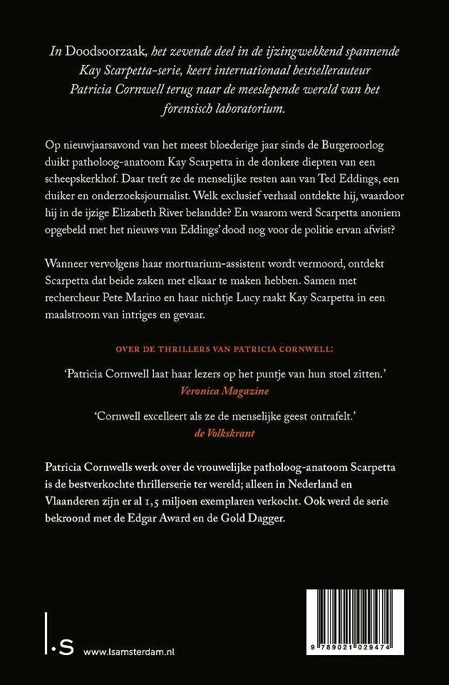 (POD) Doodsoorzaak is het zevende boek uit de bloedstollende bestsellerserie rond patholoog-anatoom Kay Scarpetta van auteur Patricia Cornwell. Deze serie, bestaande uit meer dan 20 bloedstollende crimethrillers, betekende Patricia Cornwells doorbraak als grondlegger van de pathologisch-anatomische thriller.