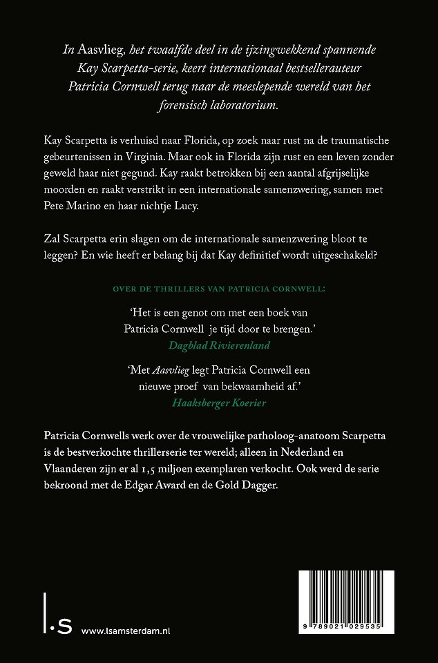 (POD) Aasvlieg is het twaalfde boek uit de bloedstollende bestsellerserie rond patholoog-anatoom Kay Scarpetta van auteur Patricia Cornwell. Deze serie, bestaande uit meer dan 20 bloedstollende crimethrillers, betekende Patricia Cornwells doorbraak als grondlegger van de pathologisch-anatomische thriller.