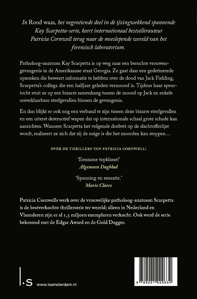 (POD) Rood waas is het negentiende boek uit de bloedstollende bestsellerserie rond patholoog-anatoom Kay Scarpetta van auteur Patricia Cornwell. Deze serie betekende Patricia Cornwells doorbraak als grondlegger van de pathologisch-anatomische thriller.