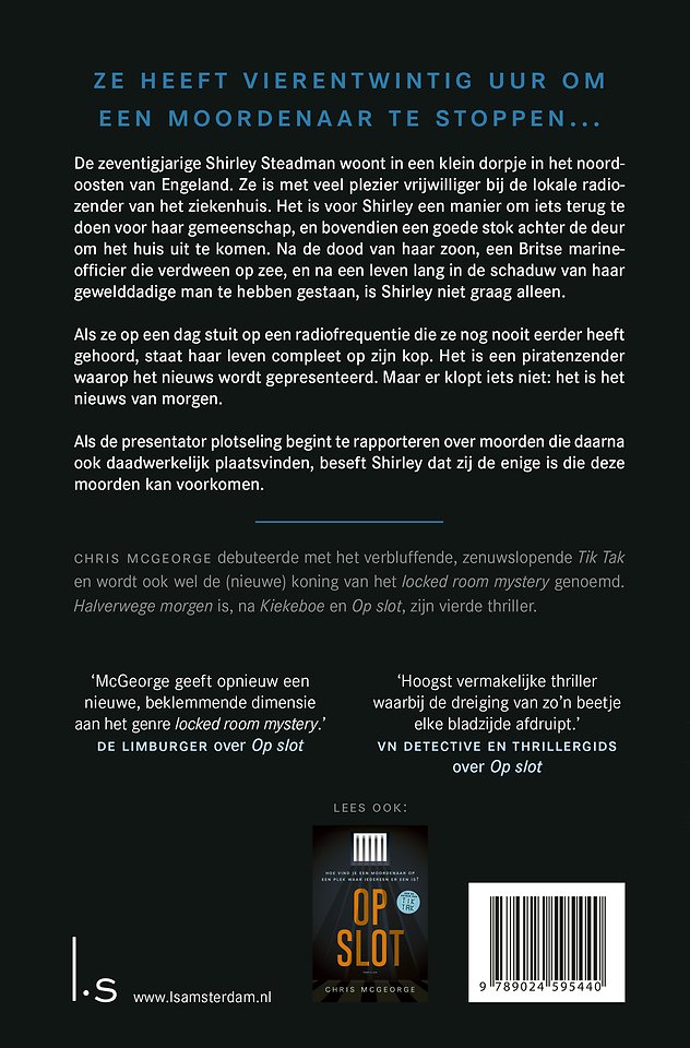 Halverwege morgen is een razend spannende thriller van bestsellerauteur Chris McGeorge (Tik Tak, Op slot) met een wel heel bijzondere hoofdrolspeelster.