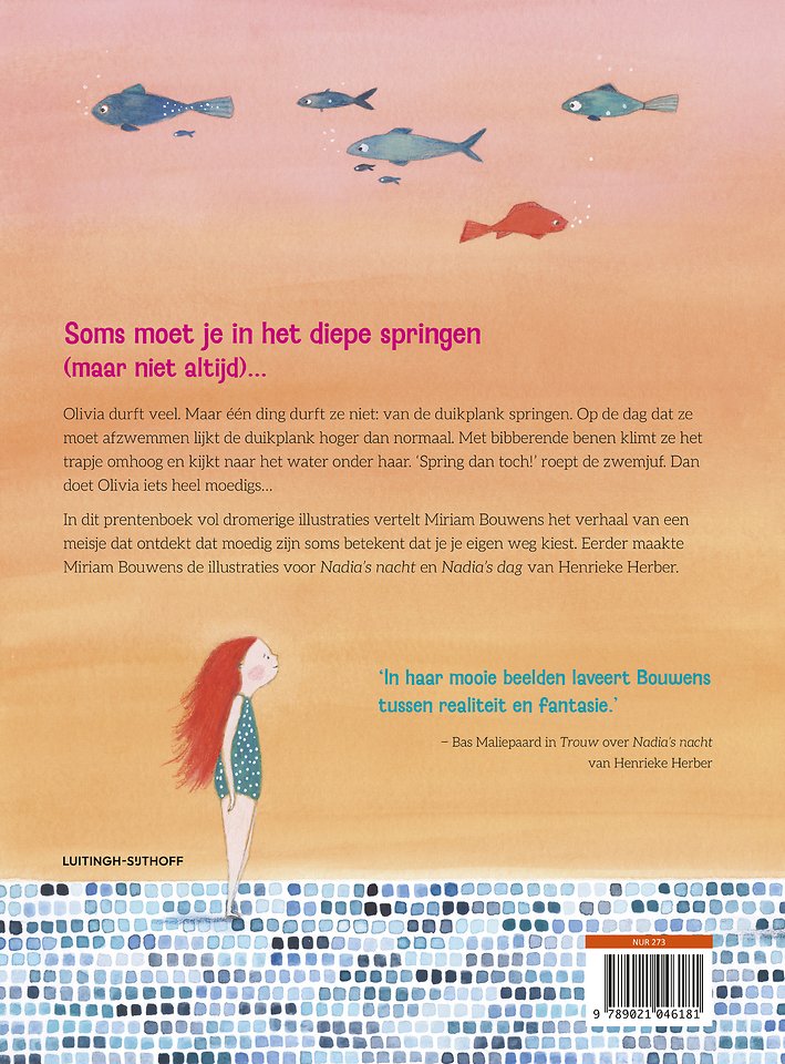 Olivia zit op zwemles. Drijven op haar rug, watertrappelen en onder water zwemmen als een vis – ze kan het allemaal. Maar van de duikplank springen durft ze niet. Op de dag dat ze moet afzwemmen lijkt de duikplank nog hoger dan normaal. Langzaam klimt ze het trapje omhoog, haar benen bibberen. Dan doet ze iets heel moedigs…